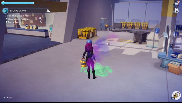 Jetzt ist es Zeit, auf den Lachboden zu gehen, damit Sie mit Sully sprechen können. Er wird Sie bitten, acht Party -Müll zu entfernen und vier Pfützen der Schlupfschleim zu beseitigen, die Sie mit Ihrer Bewässerung durchführen können. All dies ist auf dem Lachboden zu finden, also rennen Sie herum, bis Sie sie alle haben. Wenn alles schön und ordentlich ist, sprechen Sie wieder mit Sully.