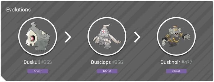 Seine Evolution, Dusclops, nimmt einen etwas leichteren, fast terrakotta roten Farbton an, während seine endgültige Form Dusknoir das Drehbuch umdreht und einen blaugrauen Körper enthält.