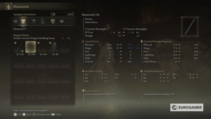Manchmal kann das Aufrüsten einer Waffe in einem Schmied sogar die tatsächliche Buchstabenqualität einer Attributskala erhöhen, wie mit dem Mondveil im Bild unten gezeigt. Das Upgrade auf Moonveil+10 würde die Geschicklichkeitsskala von C nach B erhöhen und die Ausgabe des Schadens weiter erhöhen.
