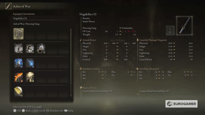 Beispielsweise würde die Auswahl der „schweren“ Affinität auf dem Nagakiba die Festigkeitsskalierung von D nach B in diesem Fall erhöhen, aber die Geschicklichkeitsskalierung vollständig entfernen.