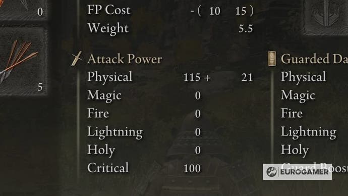 Der Wert auf der linken Seite ist der Grundschaden der Waffe (115 im Bild), der verbessert werden kann, indem die Waffe selbst mit Schmiedesteinen verbessert wird. Der Wert auf der rechten Seite bezieht sich auf die Attributskalierung (21 im Bild).