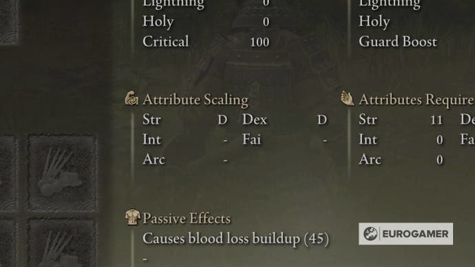 Wenn Sie zu einer Waffe in Ihrem Ausrüstungsmenü gehen Elden Ring – Unser Bild unten verwendet das Uchigatana, das mit dem Samurai geliefert wird – Das wirst du sehen Jede Art von Angriffsleistung kann zwei Zahlenwerte haben.