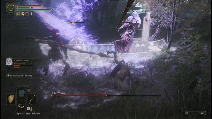 Wie bei dieser Geistasche wird es auch belohnt, indem Sie einen anderen Tibia -Mariner besiegen, den Sie finden, wenn Sie dem richtigen Weg nach Norden folgen, wenn Sie zum ersten Mal Liurnia betreten und auf seiner Autobahn in Richtung Künstlerhütte fortfahren. Überraschenderweise kämpft der spektrale Bootsmann diesmal nicht in einem Gewässer, sondern in den Wäldern.