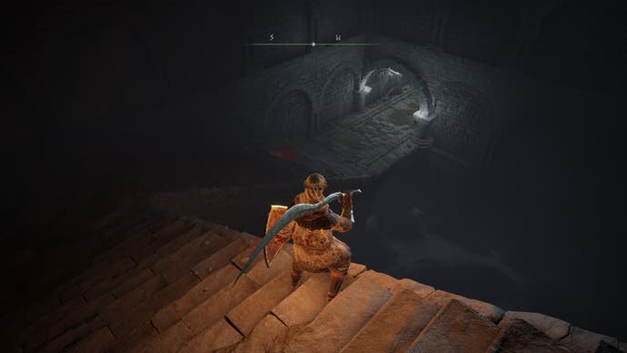 Sie müssen durch die Katakomben navigieren, um einen Hebel zu finden, um eine Tür zum Chef zu öffnen. Auf dem Weg kommen Sie jedoch zu einer dunklen Treppe mit einer Grube am Boden. Drop down und Sie werden die Asche dort finden.