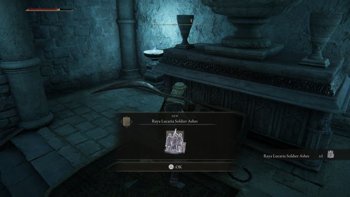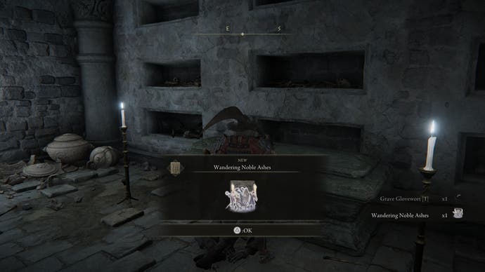 Seine Geistasche befindet sich auch in Stormfront -Katakomben und Ihre Belohnung für die Besiegung des Chefs im Inneren, einen Erdtree -Grabwächter.