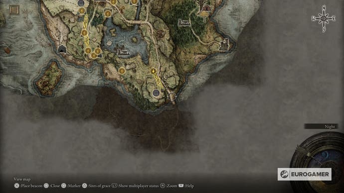 Um die Halbinsel in der Weine zu betreten, müssen Sie südlich von Limgrave gehen – Elden Ring Startbereich. Es gibt eine Brücke, die die Halbinsel mit dem Rest von Limgrave direkt neben dem verlassenen Hound Evergaol verbindet. Der Agheel Lake South Site of Grace ist der nächste auf der Brücke und zeigt Ihnen auch den Weg zum Schloss an.