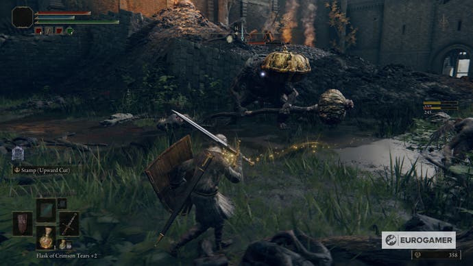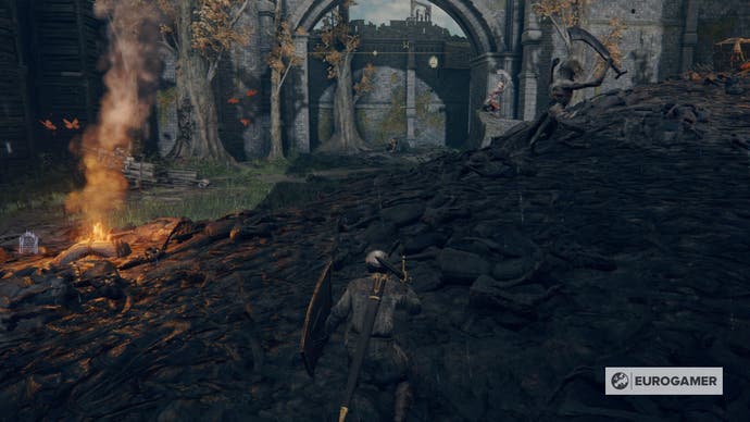 Anstatt die Feinde rechts anzugreifen, ködern Sie sie, um Ihnen zu folgen und sie zum verrückten Kürbiskopf zu führen. Diese große Kreatur wird aufwachen und die anderen Bestien angreifen. Erst nachdem der verrückte Kürbiskopf fertig ist, treten Sie ein und töten Sie die verbleibenden Feinde – vergessen Sie nicht, dass Sie hier die Spirit Ashes beschwören können.