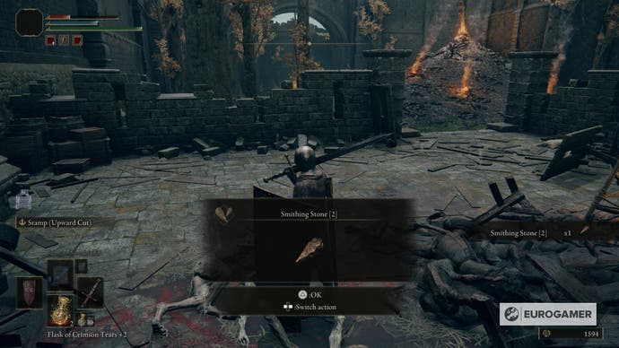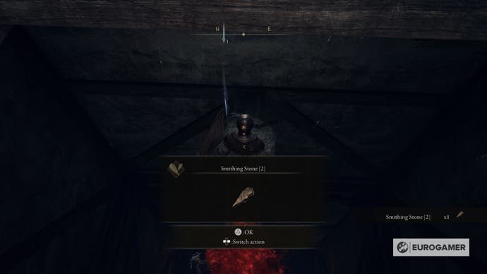 Wenn Sie sich jedoch entscheiden, sich einzuschleichen, vermissen Sie einige wichtige Gegenstände. Gehen Sie zunächst nach links, bis Sie eine Plattform eingeben. Es wird einen einzelnen Hund geben, der herumwandern. Töte es und hol den Schmelze Stein 2 an der Stelle.