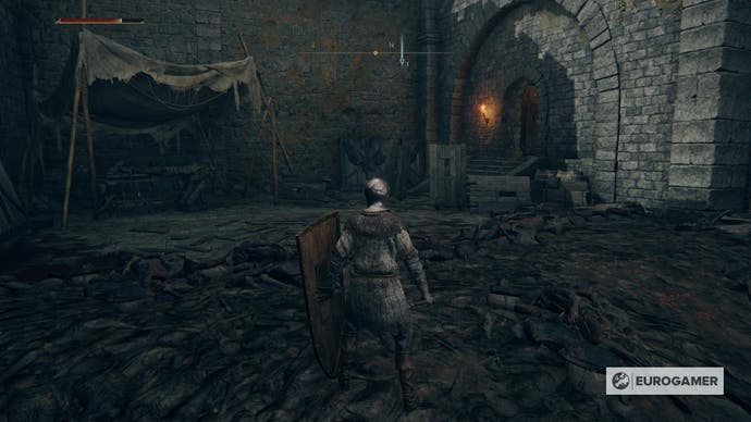 Wenn Sie in diese Richtung fahren (vorbei an der Feuerstelle), können Sie einen neuen Raum im Schloss betreten. Es wird eine Truhe mit einem Claymore auf der linken Seite geben.
