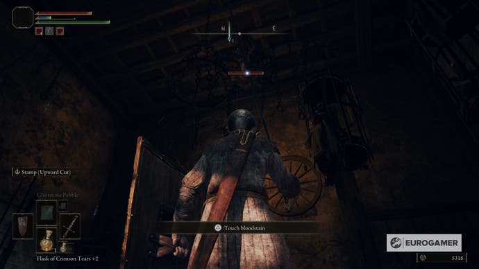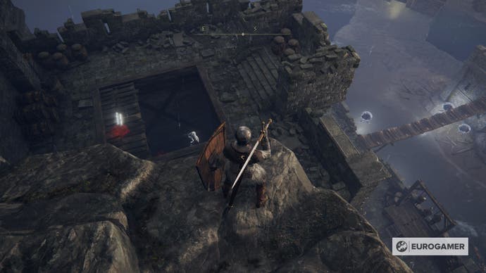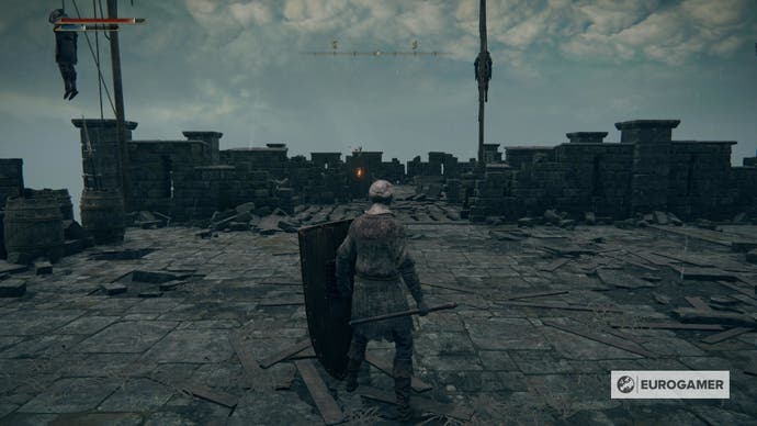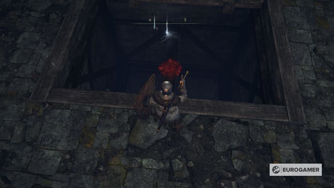 Sie müssen den ganzen Weg von hier aus mit dem offenen Dach nach unten gehen, aber seien Sie vorsichtig.Wenn Sie den falschen Sprung machen, verlieren Sie HP und sind im Nachteil mit dem, was unten liegt. Stattdessen müssen Sie in jede einzelnen Planke fallen – die erste enthält eine Leiche mit einem Schmierstein 2.