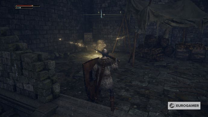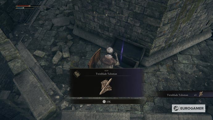 Wenn Sie jedoch das Ende der Straße erreichen, wird ein größerer Feind warten. Besiege es und klettere die Leiter links auf. Geh herum und öffne die Brust mit Twinblade Talisman.
