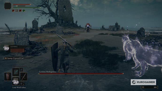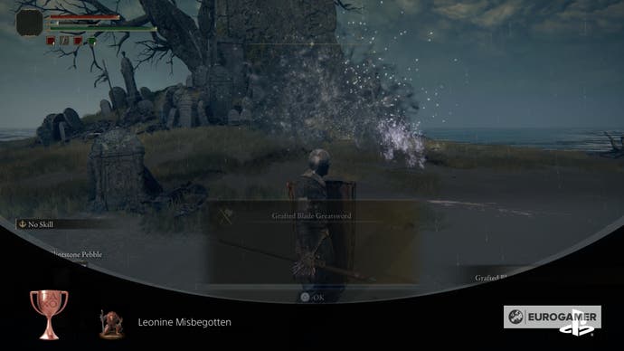 Das einzige, was jetzt fehlt, ist der Chef, Leonine Misbegotten. Gehen Sie durch den goldenen Nebel und besiegen Sie das Tier. Sie erhalten das gepfropfte Blade Great Sword, 3800 Runen und eine Bronze -Trophäe.