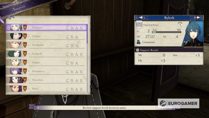 Das Unterstützungssystem zeigt Ihre Beziehung zu jedem Feuer -Emblem: Drei Häuser Charakter, jeder von C bis S reichen mit, mit S-Support der höchste Rang im Spiel sein.