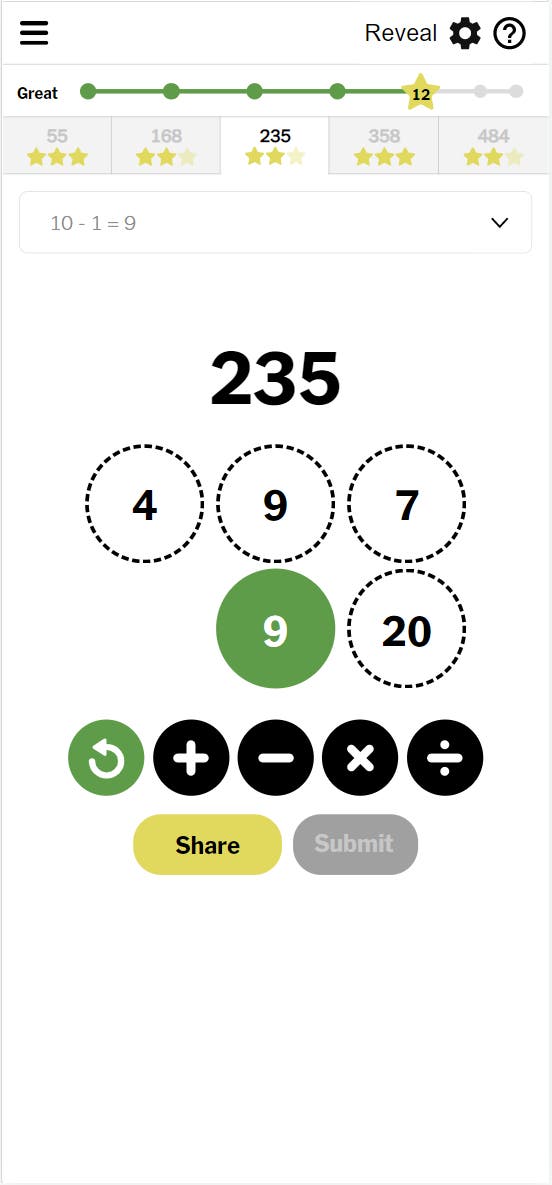 Sie werden dann mit einer Auswahl von sechs Zahlen zusammen mit den Mechaniken präsentiert, die diese Zahlen entweder hinzufügen, subtrahieren, multiplizieren oder teilen müssen. Sobald ein Spieler seine Antwort einreicht. Anders als mit Wurm wo es eine und die Situation ist, mit Ziffern gibt es fünf Berechnungen, um jeden Tag zu lösen.