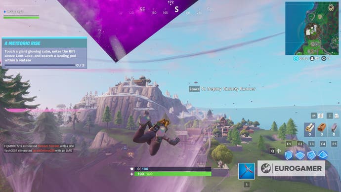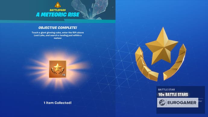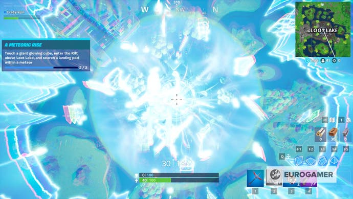 Berühren Sie einen riesigen, leuchtenden Würfel, betreten Sie den Riss oberhalb des Beuteseees und suchen Sie in einem Meteor einen Landing Pod ist eine der vielen Herausforderungen in Fortnite.