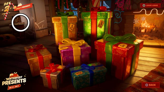 Sie werden dann zu einer schönen Fireside -Kabine gebracht, in der Sie Geschenke öffnen können jeden Tag und komplette spezielle Winterfest 2022 -Herausforderungen, wie Pizza -Scheiben zu finden.