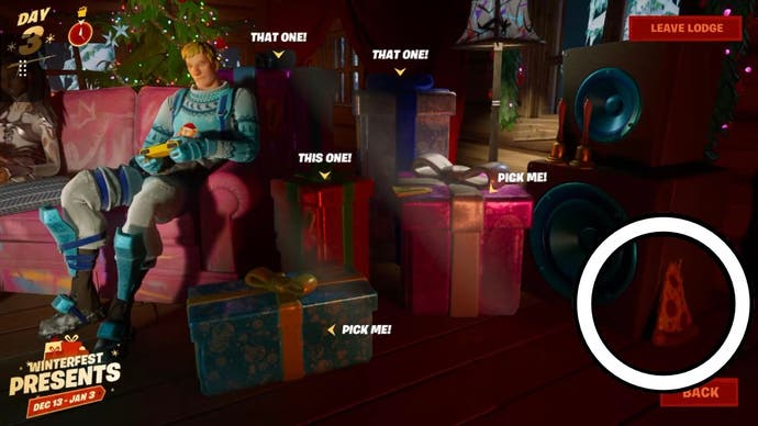 Der einfachste Weg, um die Pizza -Scheiben in einer gemütlichen Lodge zu finden, besteht darin, alle interaktivierbaren Gegenstände im Raum durchzuführen, indem Sie nach rechts und nach links und nach oben und unten mit Ihrem gehen Steuern Sie ler oder Maus. Hervorgehobene Gegenstände leuchten weiß, und Sie sollten mit allen, sogar mit den Geschenken, interagieren, um die Pizza leicht zu finden.