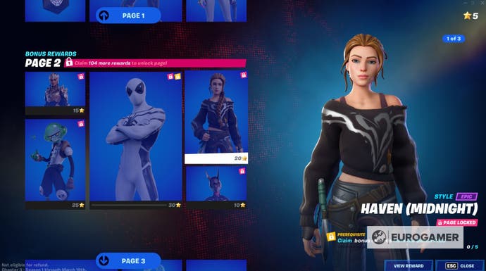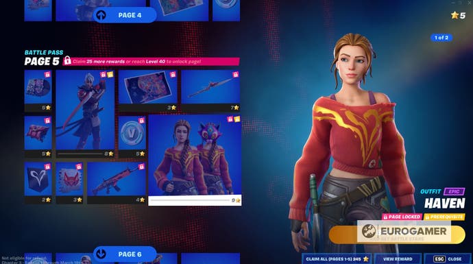 Für Haven müssen Sie beispielsweise entweder Level 40 erreichen oder 26 Belohnungen aus dem Schlachtpass freischalten, um ihre Seite freizuschalten. Als nächstes müssen Sie alle Belohnungen auf Seite 5 verdienen, um die Möglichkeit zu erschließen, Haven zu verdienen.