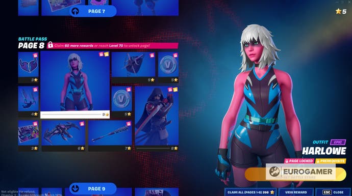 Harlowe – 9 Schlachtstars, alle Belohnungen auf Seite 8 und entweder Level 70 oder 61 Belohnungen verdient
