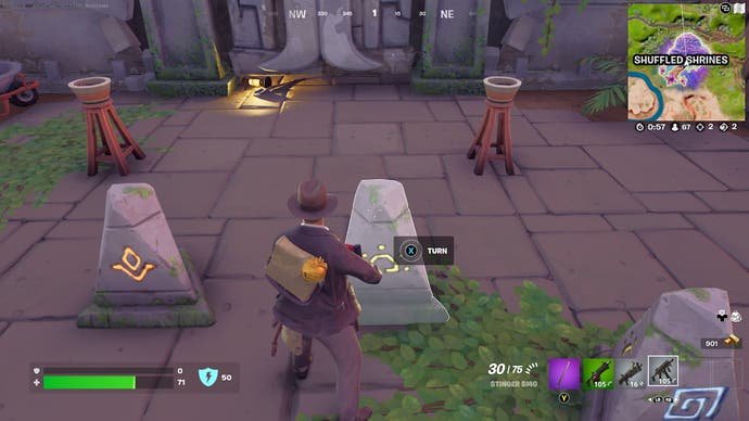 In die Hauptkammer zu gelangen und die geheime Tür in gemischten Schreinen in zu finden Fortnite Sie müssen zunächst das Runen -Symbol -Puzzle vor der Hauptkammertür lösen. Das beinhaltet Erkundung des Gebiets um gemischte Schreine auf der Suche nach vier Runensymbolen.