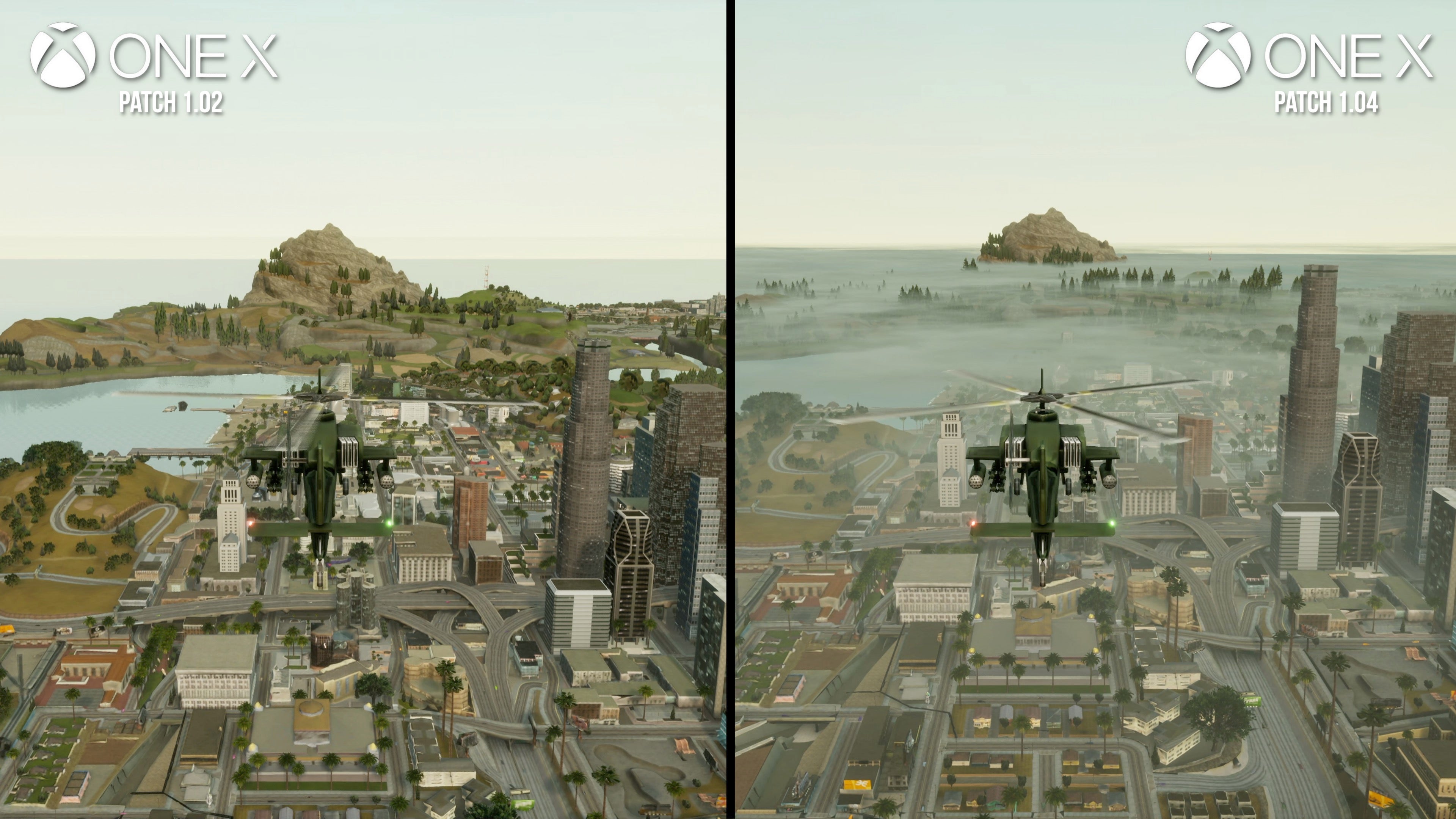 Apropos San Andreas, eines der ärgerlichsten und abstoßendsten visuellen Probleme mit diesem Spiel war die Art und Weise, wie das Spiel aus der Höhe aussah. Es gab keinen Dunst oder eine Annäherung an die atmosphärische Streuung, wodurch die Spielwelt unglaublich klein aussah. Außerdem war der Rand der Karte deutlich sichtbar, wobei das Wasser irgendwann eindeutig nicht zu weit von der Landmasse von San Andreas entfernt war. Wieder Patch 1.04 Fixiert diese und eine Bodendunstoption ermöglicht einen tief liegenden Nebel/Dunst-Effekt, der entfernte Geometrie verdeckt und der Welt ein viel besseres Gefühl für Distanz und Atmosphäre verleiht. Als Bonus sieht es ähnlich aus wie die Art und Weise, wie diese Effekte im PS2 -Original erzeugt werden, obwohl Sie hier anders als in der PS2 -Release weit über ihnen fliegen können.