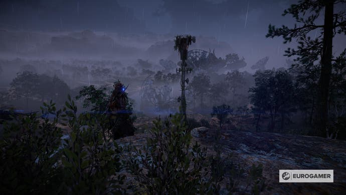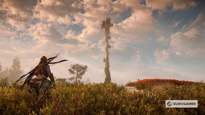 Dieser Vista -Turm befindet sich nördlich des Memorial Grove auf einem Hügel mit Blick auf den Fluss, gebrochene Flugzeuge und einige Flachlande in Horizont: Forbidden West. Es steht über den Straßenmarkierungen, die die Leute zum Memorial Grove und Cliffwatch am Lagerfeuer zeigen.