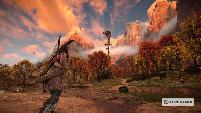 Dieser Vista -Turm befindet sich nordöstlich von Speer in den Bergen hoch über einem sonnenschwingenden Standort in Horizont: Forbidden West.
