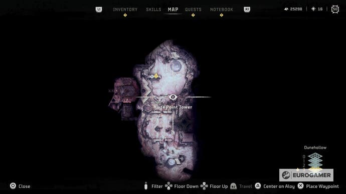 Der Vista -Punkt kann nördlich des Turms vorliegen. Geh nach Norden und klettern Sie die kurze Klippe. Es wird eine Betonplattform mit einer gebrochenen Schiene mit Blick auf den versteckten Ember geben. Sie finden ein kleines Oseram -Camp in der Gegend zusammen mit einigen Burrowers.