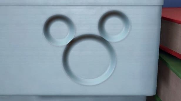 Das nächste glückliche Emblem ist richtig in der Fabrik – im Erdgeschoss sparen Punkt. Überprüfen Sie die Farbbehälter und Sie werden Farbflecken auf dem Boden erkennen, wobei die rosa Verschüttung misstrauisch wie eine bestimmte Cartoon -Maus aussieht.