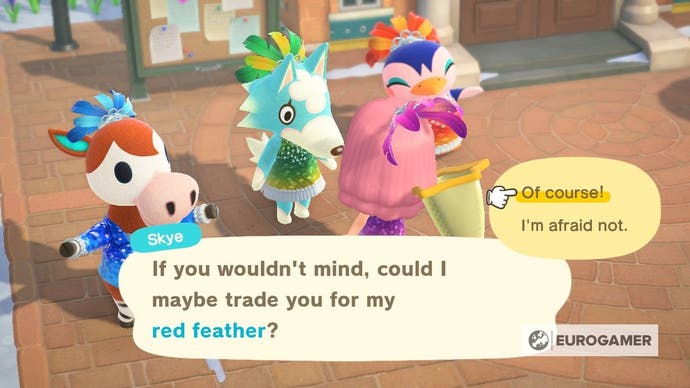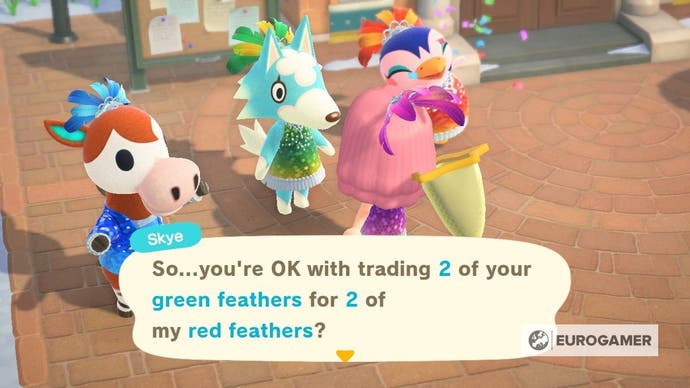 Wenn Sie Probleme haben, eine bestimmte Federfarbe zu finden, nehmen Sie sich die Zeit, mit Ihren Dorfbewohnern zu plaudern. Sie jagen auch Federn und werden gerne handeln.