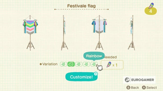 Wenn Sie einen Festivale -Artikel anpassen möchten, müssen Sie eine Reihe von Regenbogenfedern basteln oder sammeln. Die Menge an Regenbogenfedern unterscheidet sich, je nachdem, welchen Artikel Sie anpassen möchten, und es ist wichtig zu beachten, dass der Festivale Float das einzige Element ist, das nicht angepasst werden kann.