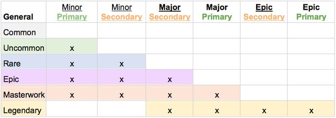 Inschriften haben auch selbst „Ebenen“ von Qualität, die BioWare als Haupt-, Klein- oder Epos von der niedrigsten Qualität der Inschrift (z. B. +1% Waffenschäden) bis zur höchsten (z. B. +200% Waffenschaden) bezeichnet. Andrew Johnson, der Community -Lead des Studios, teilte die folgende Infografik über Reddit mit, um die Unterschiede in den verfügbaren verfügbaren Seltenheit zu visualisieren: