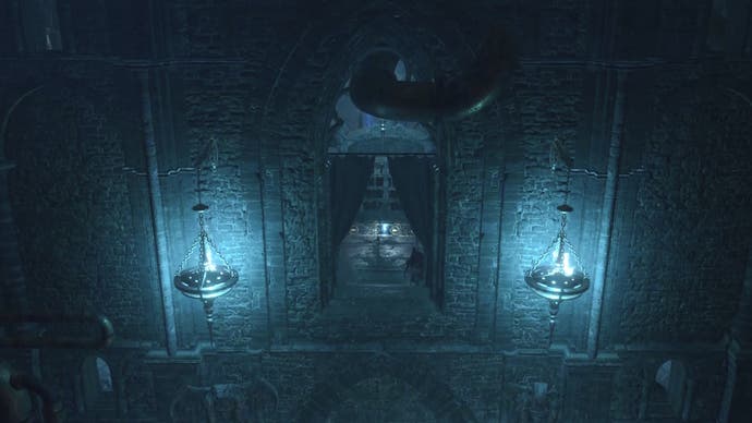 Gehen Sie mit dem ausgerüsteten Leitring zurück zum Aufzug, um einen versteckten Knopf zu enthüllen, der Sie direkt zum arkanen Turmkeller führt.
