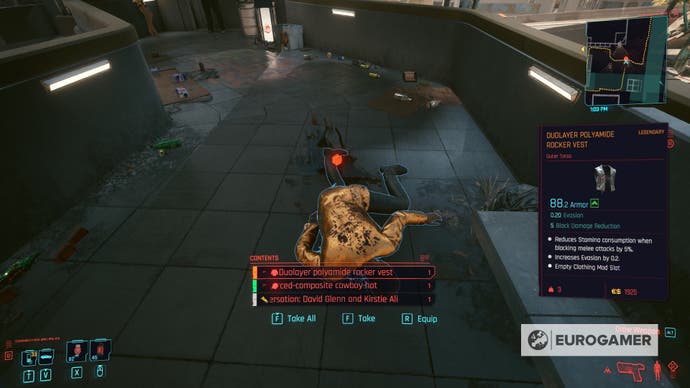 Wie kommt man: Aus dem Bellevue Overwalk Fast Travel Checkpoint in Kabuki, Watson, gehen Sie zu den Treppen, die ihnen überlassen bleiben. Gehen Sie nach oben und Sie sehen einen Körper am weiteren Ende des Korridor. Plündern Sie es, um die Duolayer -Polyamid -Rockerweste sowie die MíRahmen Cowboyhut verstärkter Kompositionen.