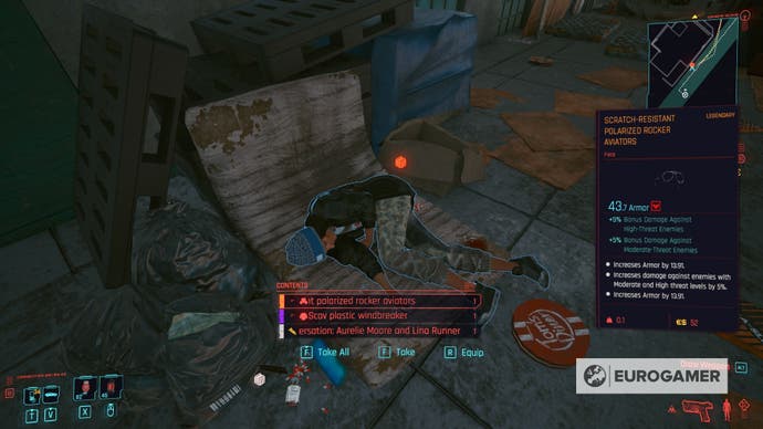 Plündern Sie den Körper, um die kratzfesten polarisierten Rocker-Flieger sowie einen Scav-Plastikwindbrecher und andere Gegenstände zu ergreifen. Denken Sie daran, dass die Flieger eine Anforderung der Stufe 18 haben.