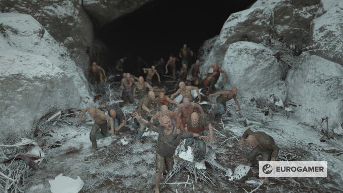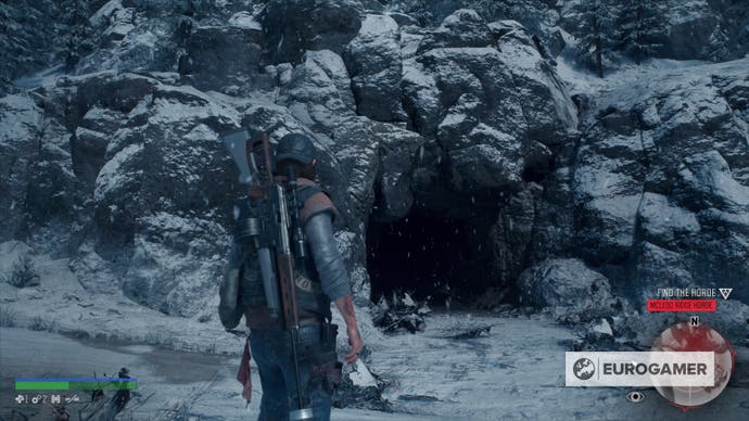 Fahren Sie nach Nordosten auf der Straße vom Horse Lake Nero Checkpoint, bis Sie auf eine Reihe von Höhlenmündern auf der linken Seite des Asphalts stoßen. Suchen Sie nach dem Höhlenmund, der mit Ästen und Blut geschmückt ist, und wagen Sie sich nach innen, um die Horde zu finden.