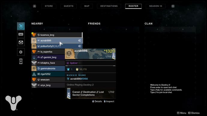 - Besuchen Sie den Kaderbildschirm im Spiel auf derselben Plattform wie Ihr Freund und fordern Sie sie als Bungie-Freund an, dass sie dann auf allen Plattformen erscheinen können.