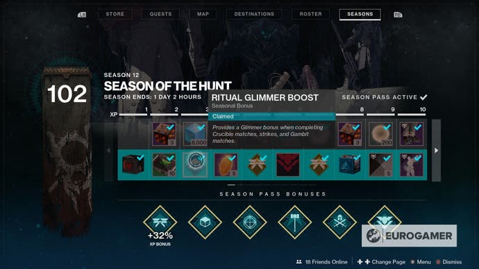 - Fortschritte durch den Saisonpass. Es gibt nicht nur einen tatsächlichen Glimmer der Belohnungen, es gibt normalerweise auch einen „Glimmer -Boost“, der Ihnen beim Ausfüllen ausgewählter Aktivitäten einen kleinen Bonus verleiht.