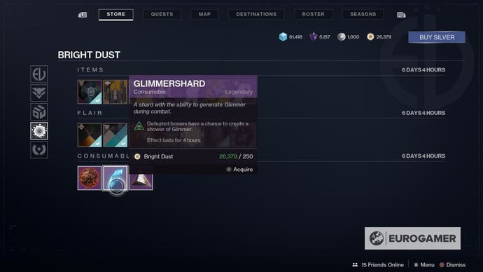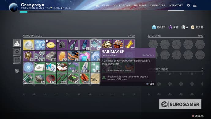 - Anwenden von Regenmachern und Glimmershards vor dem Spielen anwenden. Diese dauern vier Stunden und bieten die Chance, bei der Durchführung von Präzisions -Kills bzw. Boss -Kills ein wenig mehr Schimmer fallen zu lassen. Dies ist ein bescheidener Schub, aber wenn Sie vorhaben, eine RAID zu spielen oder sich mehrere Stunden lang Patrouillenaktivitäten zu unterziehen, sind sie es wert, benutzt zu werden. In Bezug auf die Beschaffung haben Regenmacher eine zufällige Chance, beim Abbau der Ausrüstung zu fallen, während Glimmershards mit hellem Staub aus dem Laden gekauft werden.