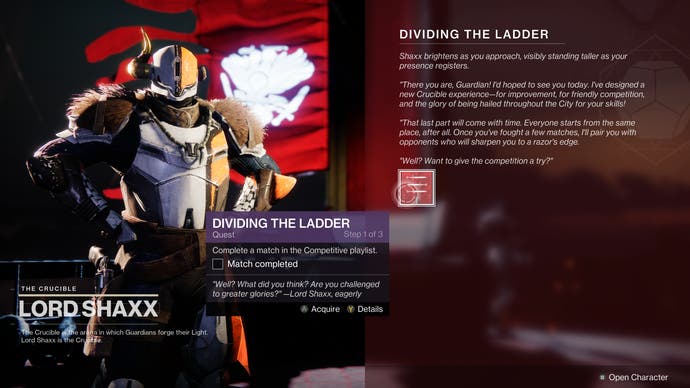 Besuchen Sie Lord Shaxx im Turm, und er wird Ihnen die Suche zuweisen. Ihre Mission: Komplette Platzierungsübereinstimmungen in der Wettbewerbs -Wiedergabeliste des Schmelztiegels.