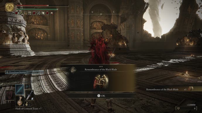 Maliketh Die schwarze Klinge lässt 220.000 Runen bei der Niederlage fallen, eine beträchtliche Belohnung für Ihre Bemühungen. Es wird Ihnen auch die gewähren Erinnerung an die schwarze Klinge Artikel, der im Roundtable -Hold gegen einige leistungsstarke Gegenstände und Fähigkeiten ausgetauscht werden kann.