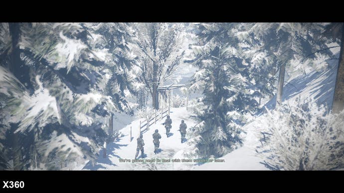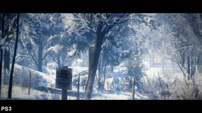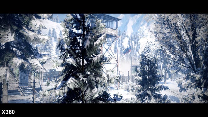 Eine „Bildschirmtür“ -Effekt auf ein Laub, das in den Schneespiegel am offensichtlichsten ist, sieht auf Xbox 360 ein Hauch von rau aus, während es auf PlayStation 3 überhaupt kein Problem ist. Obwohl es nicht gerade ein großes Problem ist, ist es zweifellos der Fall, dass die PS3-Version ohne sie besser aussieht und eine konventionellere Alpha-Test-Technik für ihre Transparenz verwendet. Während es in der schneebedeckten Ebene am offensichtlichsten ist.