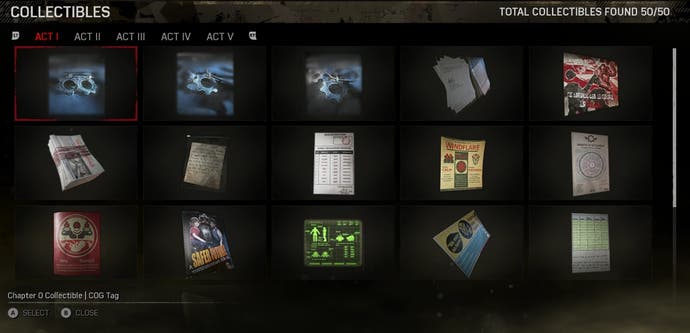 - Wenn Sie jedes Sammlerstück im Spiel sammeln, werden insgesamt vier Erfolge freigeschaltet.Collector (5G, wiederhergestellt fünf Sammlerstücke), Packratte (10 g, wiederhergestellt zehn Sammlerstücke), Completist (15G, alle Sammlerstücke wiederhergestellt) und erinnern sich an die Gefallenen (15G, habe alle COG -Tags in der Kampagne wiederhergestellt).
