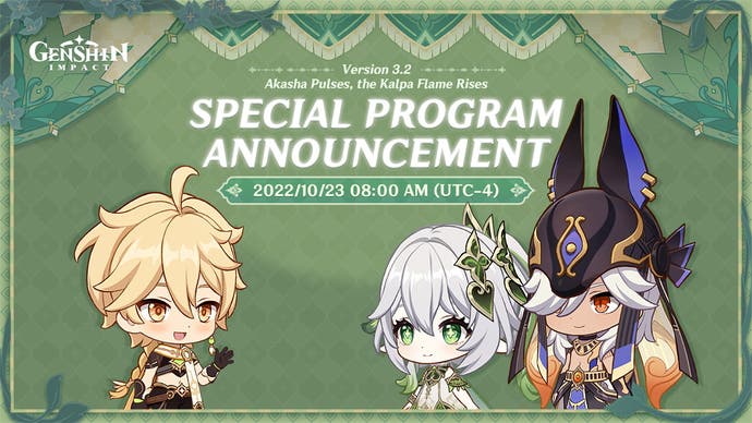 Der Gen -Auswirkung 3.2 Livestream ist eingeschaltet Sonntag, 23. Oktober um 8 Uhr (UTC-4) auf den Beamten Genshin Impact Twitch Channel.