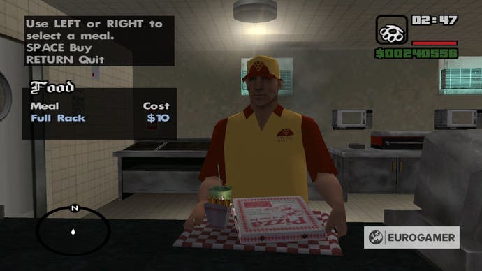Um zu verhindern, dass der Muskel in GTA San Andreas abnimmt, wird empfohlen, mindestens einmal am Tag zu einem der folgenden Lebensmitteleinrichtungen zu gehen: