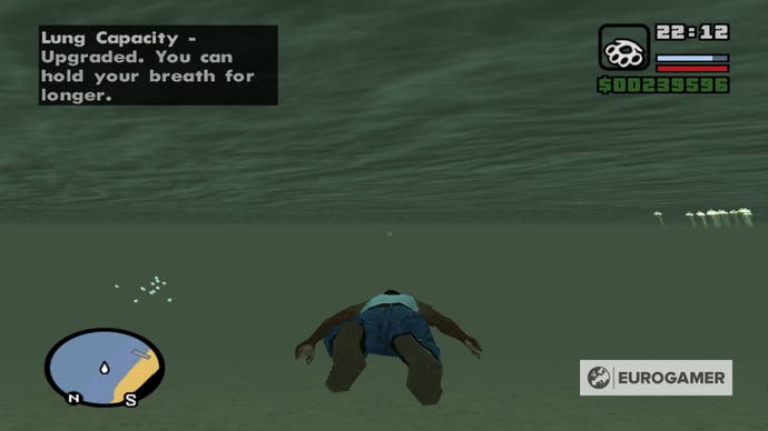 Wenn CJ schwimmt, zeigt die Lungenkapazität, wie lange Sie beim Tauchen unter Wasser den Atem anhalten können. Wenn der Spieler zu lange unter Wasser bleibt, wird das Sauerstoffmessgerät erschöpft, und CJ verliert die Gesundheit, bis er entweder ertrinkt oder aus dem Wasser kommt.