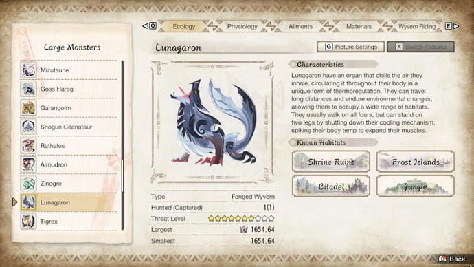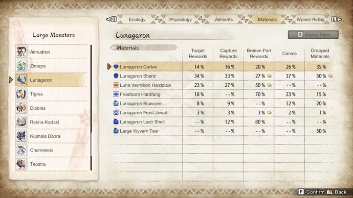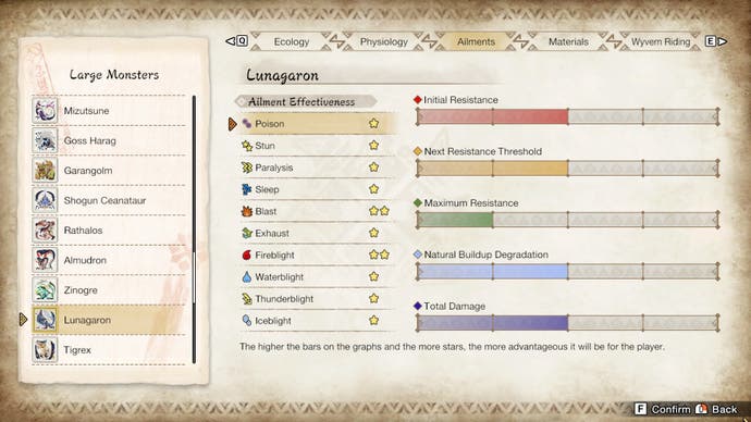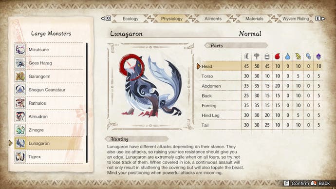 Es gibt auch eine Monsterliste, sowie einzelne Seiten zum Schlagen von Garangolm, Lunagaron und Shogun Ceanataur.