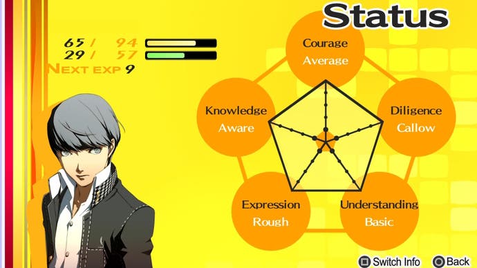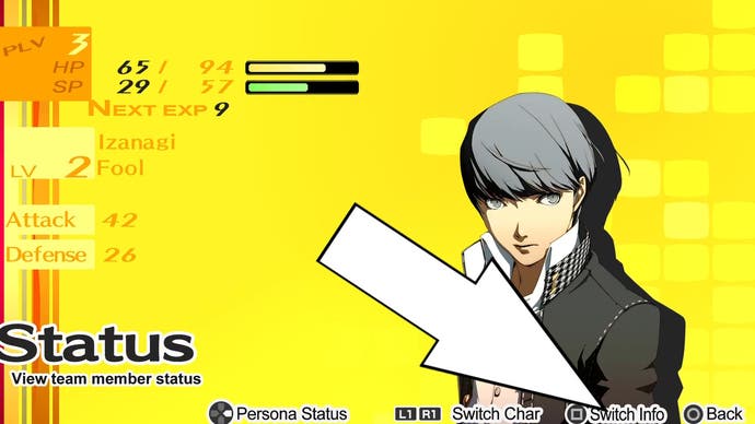 Um Ihre Sozialstatistiken zu überprüfen in Persona 4 Golden, klicken Sie im Hauptmenü auf „Status“, klicken Sie auf den Status des Protagonisten und wählen Sie „Switch Info“ aus.