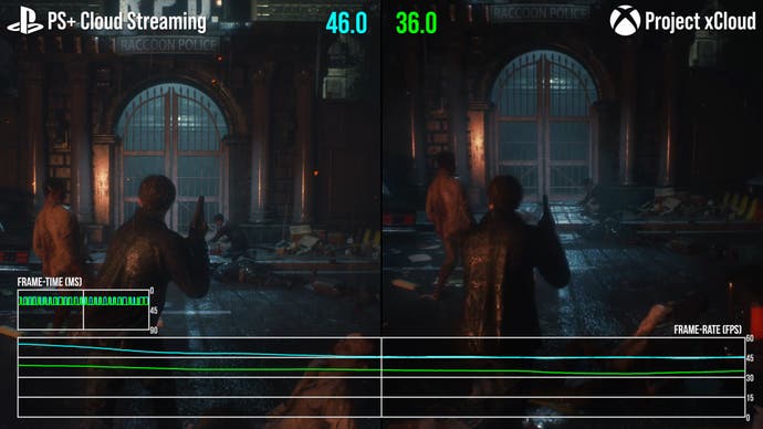 Nur um sicherzustellen, dass ein Pest-Tale-Requiem kein unglückliches Einzelspiel ist, musste ich noch ein Multi-Plattform-Spiel ausprobieren: Resident Evil 2 Remake. Hilfreich ist der Ray Tracing -Modus des Spiels des Spiels in allen Versionen des Spiels enthalten – sogar Serien S – und so im weiteren Sinne ist es in der Xbox Cloud -Version verfügbar. Keine aktuelle Maschine liefert in diesem Modus perfekte 60 fps mit einer häufigen Leistung von Sub-60FPS in den Straßen der Waschbärstadt, aber es ist perfekt für unser Benchmarking.
