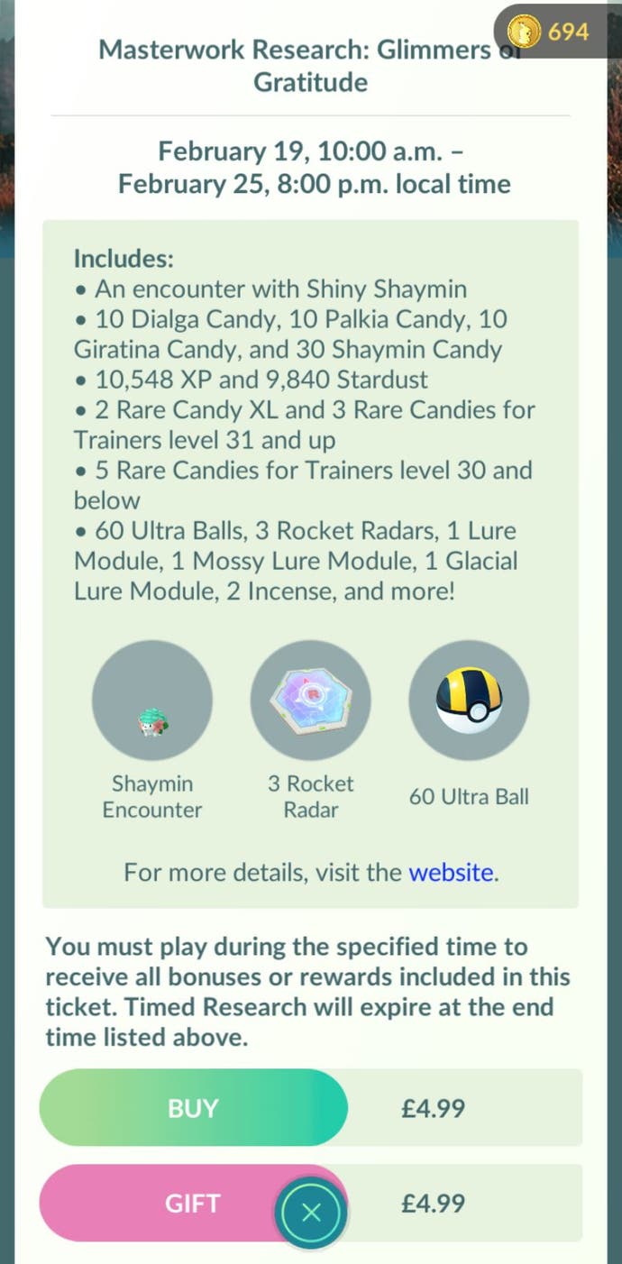 Was Sie vielleicht kaufen möchten, ist das Pay-to-Play Meisterarbeitsforschung: Glimmer der Dankbarkeitsquest. Mit dieser Quest können Sie Ihrem einen glänzenden Shaymin hinzufügen Pokémon Sammlung auf Kosten von £4.99, $ 4.99 oder das Äquivalent in Ihrer lokalen Währung. Denken Sie daran, dass diese Quest nur am Sonntag, dem 25. Februar.